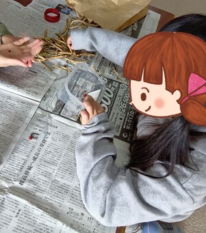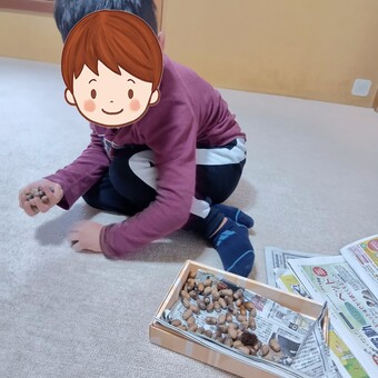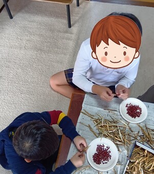 小豆の豆を取り出す作業。「これがあんこになるんだね」と喜んで手伝ってくれました。相談した結果、どら焼きにしようということで、後日おやつに美味しくいただきました。