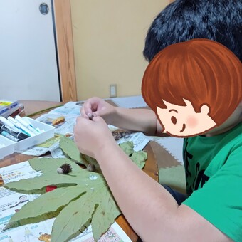 後日、秋をイメージして色付いた葉っぱやどんぐりで工作をしました。