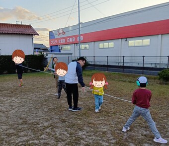 ある日の公園。子どもたち発案で、綱引きをして盛り上がりました。