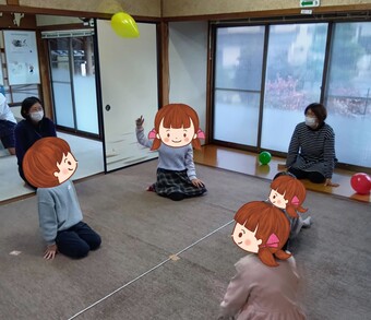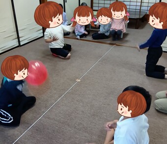 風船バレーは、風船があれば室内でも簡単、安全に楽しく取り組めます。子どもたちに風船を膨らましてもらいました。最初は息を吹き入れる力が必要です。最後は風船を縛る動作も加わり、一見簡単そうに見えて色々な力が養われます。ゲームを始める前に、どうしたら安全に楽しくできるかを全体でルール確認しました。室内の限られた空間で行う為、「座ってすること」をルールに入れました。チーム戦の為、協力が必要になります。風船はゆるやかに動くので、「〇〇さんお願い」と声も掛け合いやすいと感じました。うまくいかなかった時には我慢したり、励ましたり、作戦を変えたりと、素敵なやり取りがみられました。