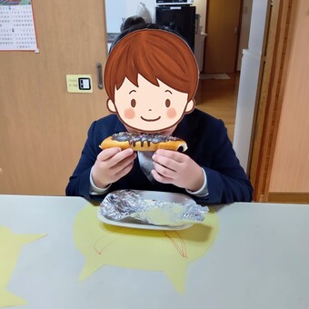 節分の日のおやつは、鬼型に切った紙に個々に表情を描いてランチマットにして、鬼のこん棒パンと殻付きピーナツを食べました。パンは食べきれるかな?と思いましたが、ぺろりと食べる子どもたちでした。